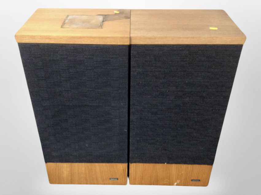 A pair of teak-cased Goodmans floor standing speakers, height 76cm.