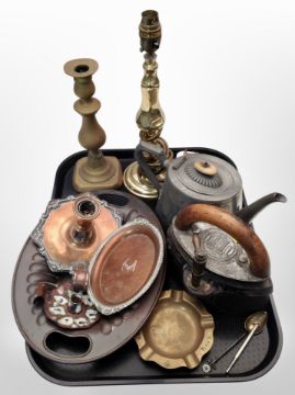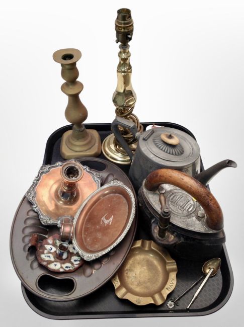 A group of metal wares including a 19th century pewter teapot, brass candlestick and lamp base, iron, chamber sticks.