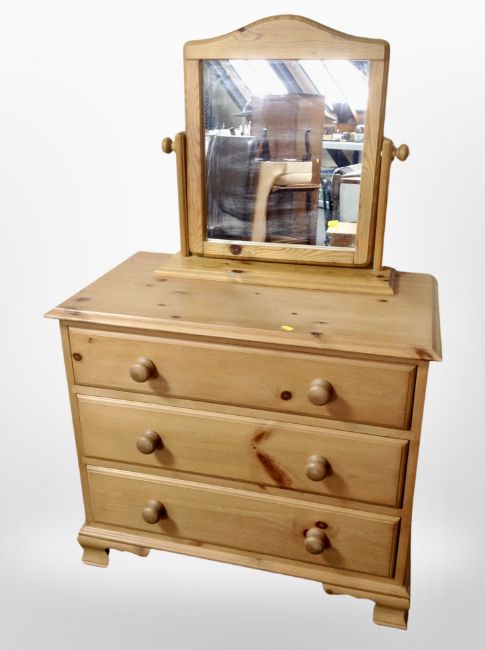 A contemporary pine three drawer chest, 81 cm x 45 cm x 70 cm, together with a swing dressing table mirror