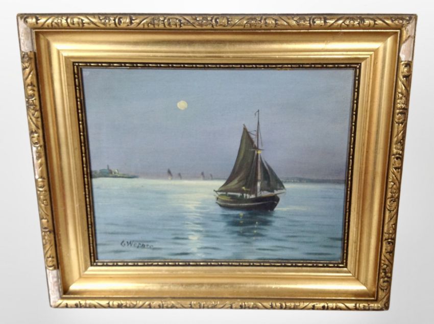 G Werner : A fishing boat on calm moonlit waters, oil on canvas, 27cm x 21cm.