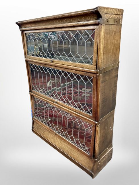 An Edwardian and oak leaded glass three tier stacking bookcase, in the style of Globe-Wernicke, 85 cm x 29 cm x 118 cm