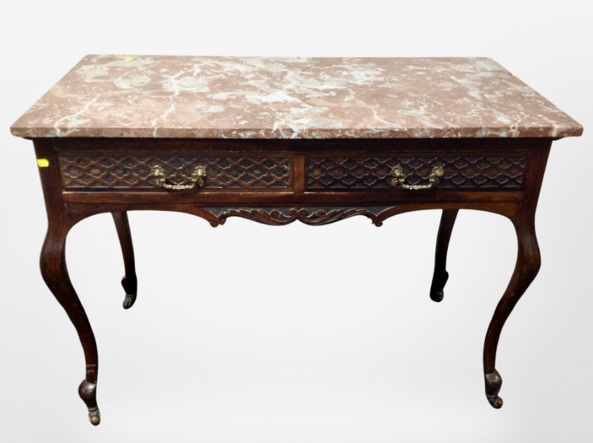 A 19th century mahogany two drawer side table, with rouge marble top on cabriole legs, 107 cm x 56 cm x 77 cm