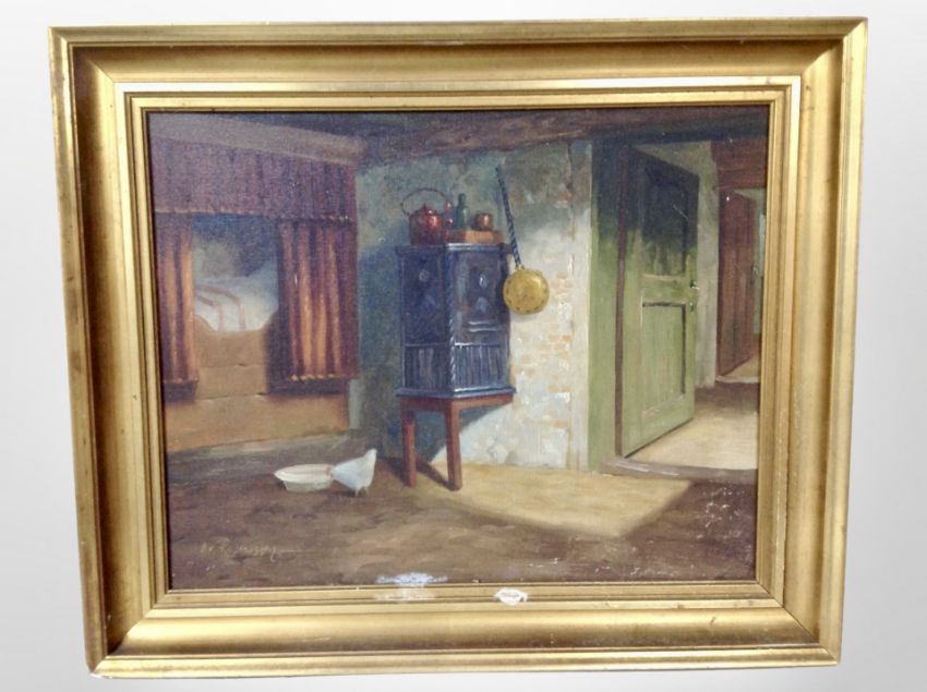 Rasmussen : Chicken in a cottage interior, oil on canvas, 48 cm x 38 cm