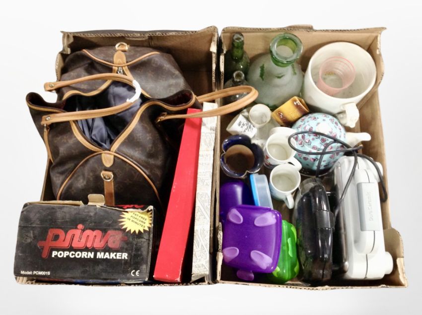 Two boxes containing Louis Vuitton-style hold-all, glass wares, popcorn maker, stainless steel dish, electricals.
