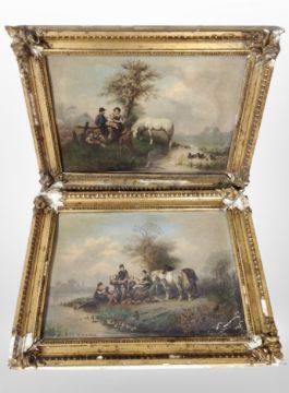 A pair of 19th century colour prints in gesso frames, each 40cm x 30cm overall.