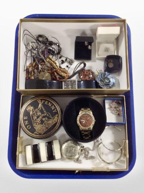 A group of costume jewellery, contemporary pocket watch, wristwatch, necklaces and bangles, etc.