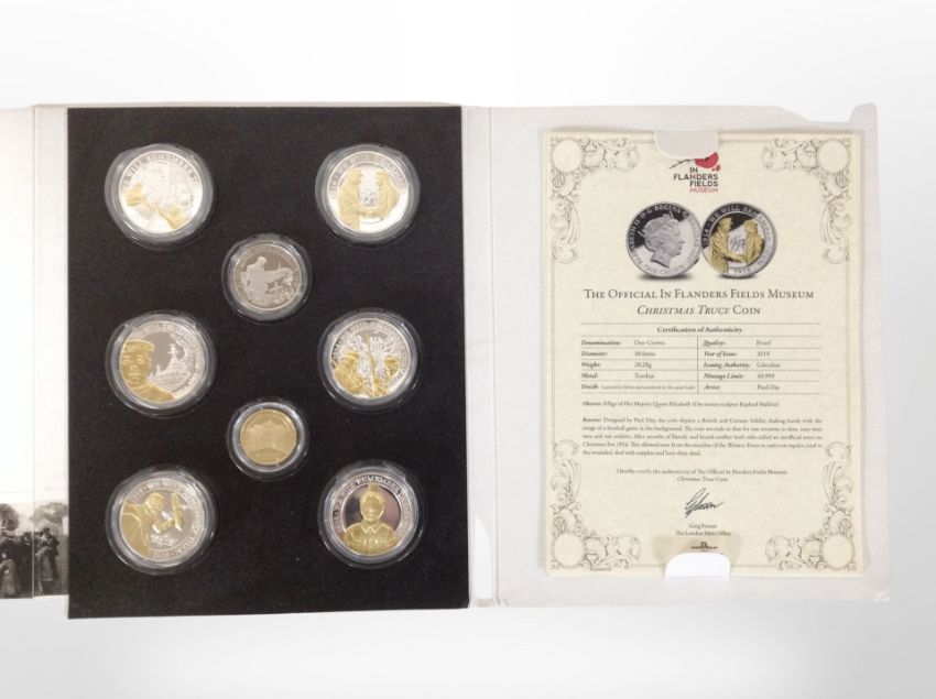 A set of eight 'In Flanders Field Museum' commemorative coins in folder, with certificate.