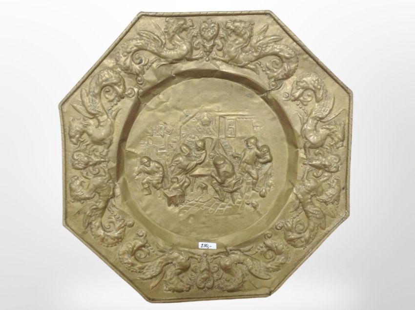 A contintental embossed octagonal brass charger, diameter 59cm.