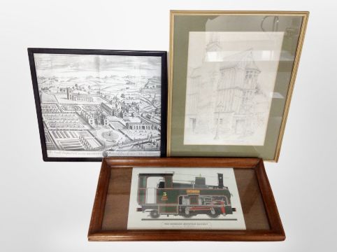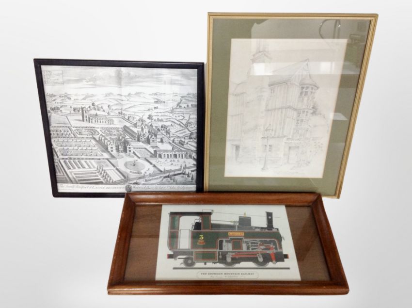 A mahogany-framed print of a Snowdon mountain railway locomotive, further monochrome picture of Castle Bromwich, and one further picture.