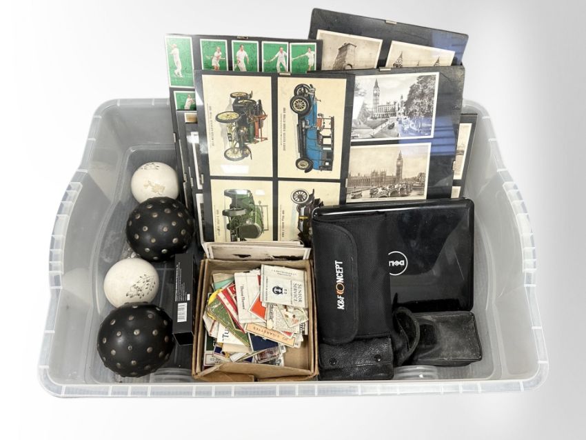 A group of framed postcards and cigarette cards, together with two pairs of field binoculars, a Dell mini laptop, etc.