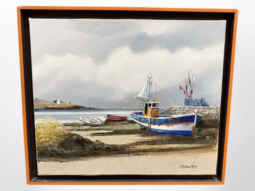 Jean-Pierre Betraux-Marais (French, b. 1936-) : Fishing boats at low tide with calm waters beyond, oil on canvas, signed, 46cm x 55cm, framed.