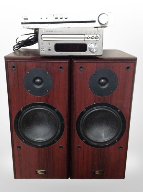 A Technics stereo tuner ST-C 01, a Denon CD receiver RCD-M33, and a pair of speakers in rosewood-veneered cases.