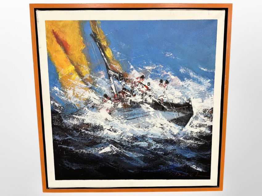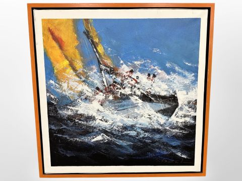 Contemporary school : Sail boat in rough waters, oil on canvas, 65cm x 65cm, indistinctly signed.