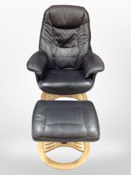 A late 20th-century Danish beech and black stitched leather swivel armchair and matching footstool.