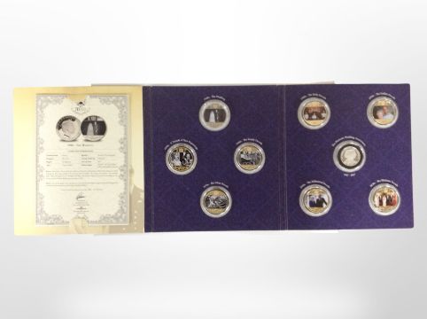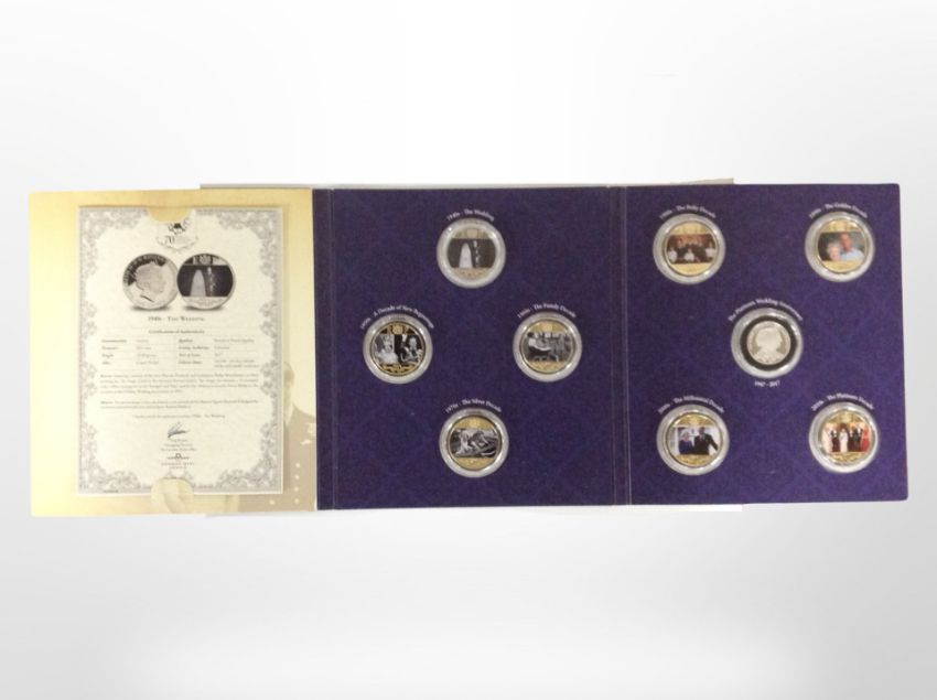 A set of nine London Mint commemorative coins, The Platinum Wedding Anniversary, in folder with certificate.