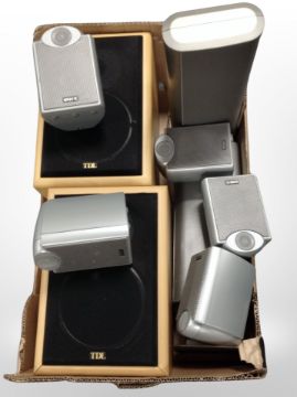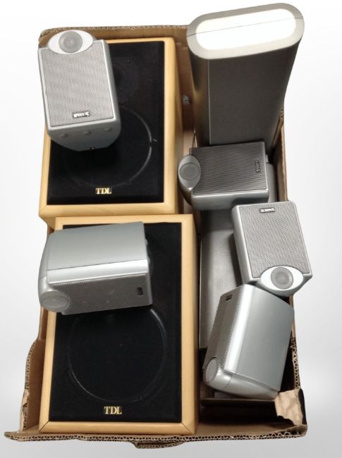 A box of speakers including TDL, Denon, and Tannoy.
