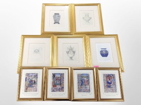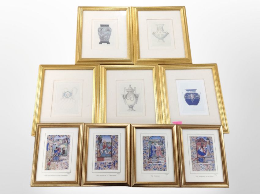 A group of four limited edition gilt-framed religious prints, pages from the Book of Hours, together with five further similarly framed prints.