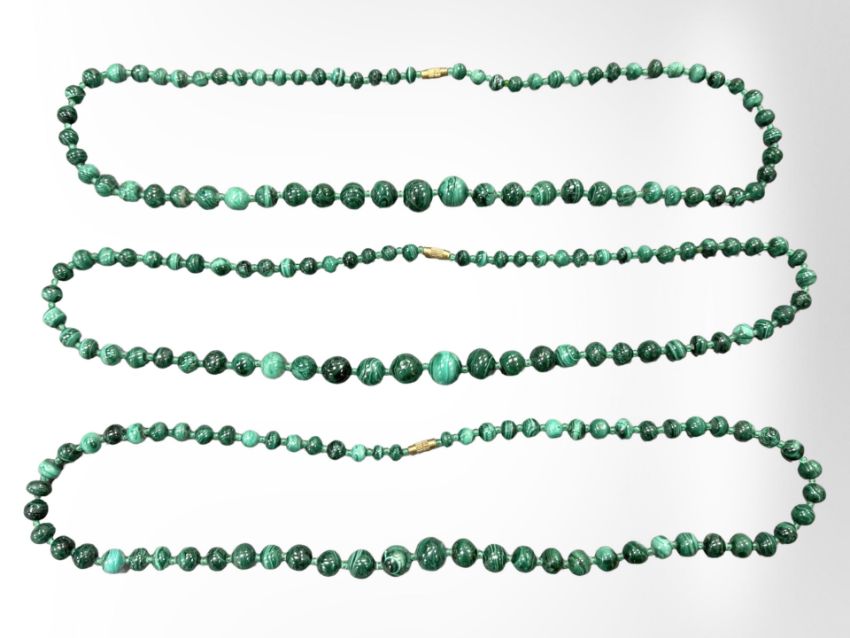 Three graduated malachite necklaces. (3)
