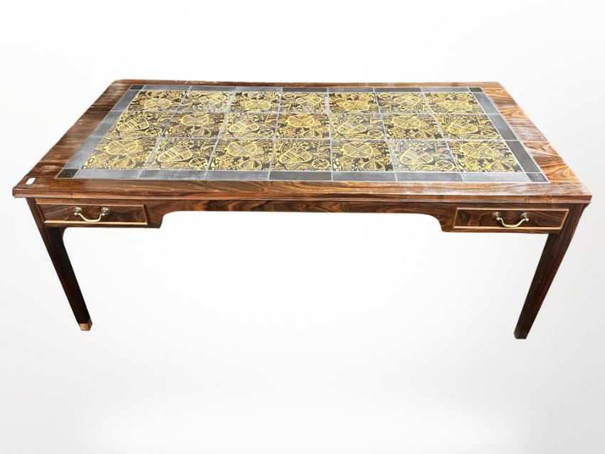 A 20th-century Danish rosewood effect and tile-topped rectangular coffee table fitted two drawers, 130cm x 64cm x 52cm.
