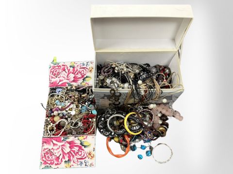 Two boxes containing a quantity of mixed costume jewellery, including bangles, bead necklaces, etc.