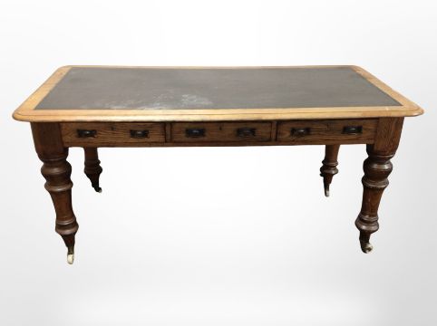 A late Victorian oak library table fitted three drawers with leather inset panel, 152cm x 76cm x 72cm.