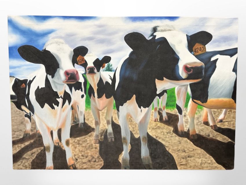 Contemporary school : Dairy cows, oil on canvas, 77cm x 112cm (unframed).