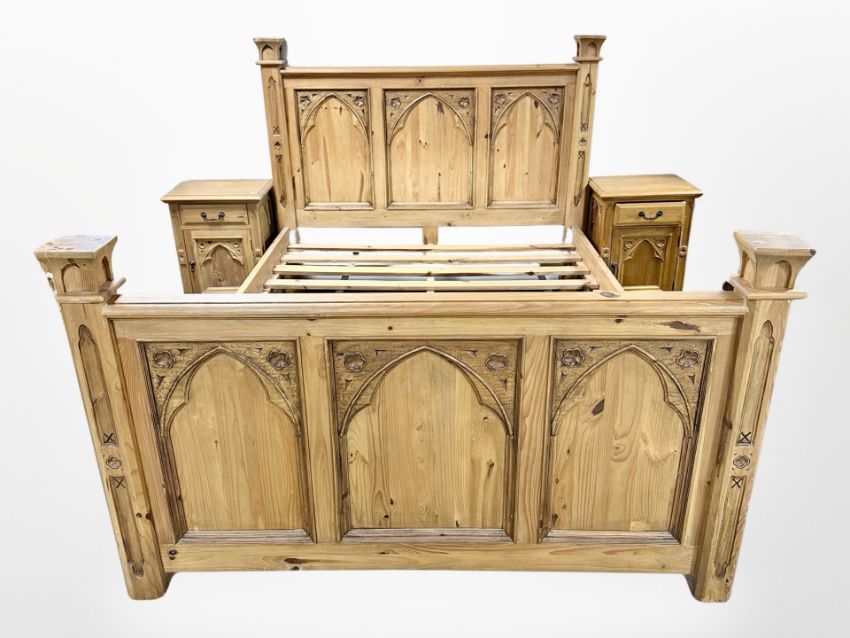 A Gothic style carved pine 5' bed frame, width 171 cm overall