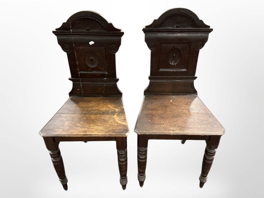 A pair of 19th century carved oak hall chairs, width 42 cm