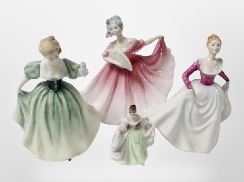 Three Royal Doulton Ladies: 'Lisa' HN3265, 'Lily' HN3902, 'Elaine' HN3307, and a further miniature figure, 'Sara' HN3219.