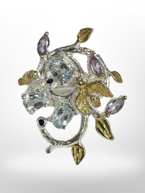 An African blue topaz and amethyst sterling silver gold plated ring