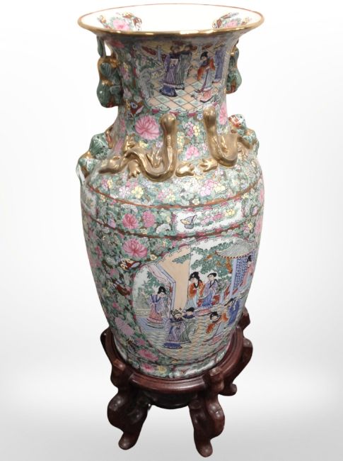 A 20th century Cantonese porcelain baluster vase on carved hardwood stand, height 85 cm