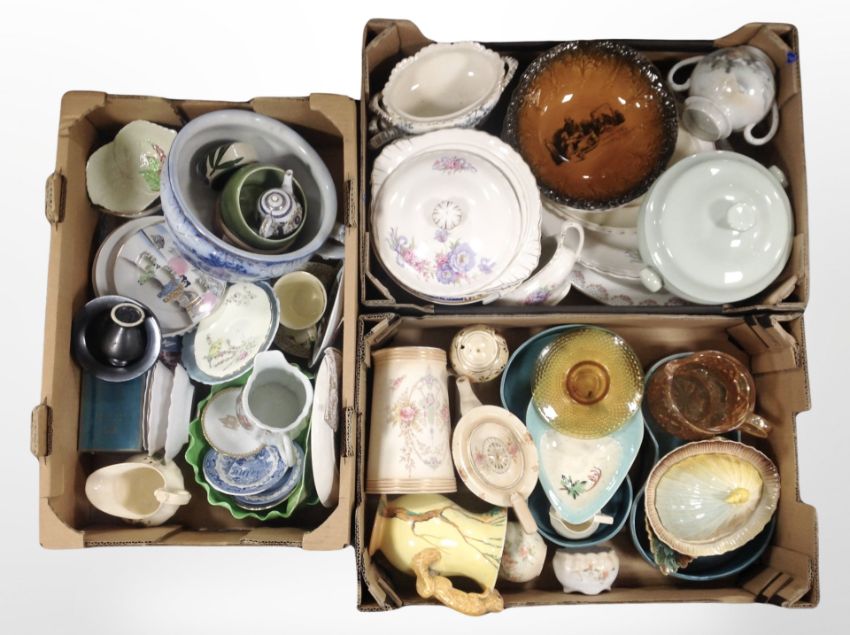 Three boxes containing assorted ceramics and glass wares, Carltonware leaf dishes, Japanese export ceramics, dinner wares.