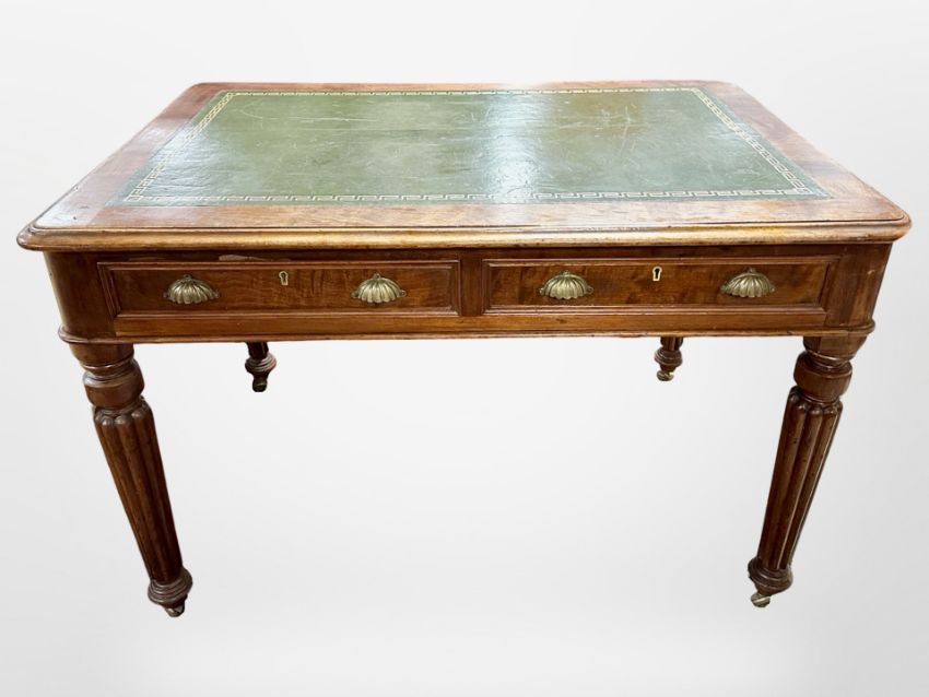 A Victorian mahogany library table fitted two drawers with green tooled leather inset panel, 105 cm x 71 cm x 69 cm