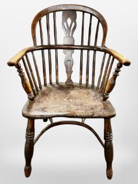 A 19th century stained elm Windsor chair with crinoline understretcher, width 54 cm