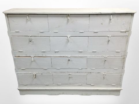 A Victorian painted pine bank of twelve pigeon hole shelves, 124 cm wide x 25 cm deep x 100 cm high
