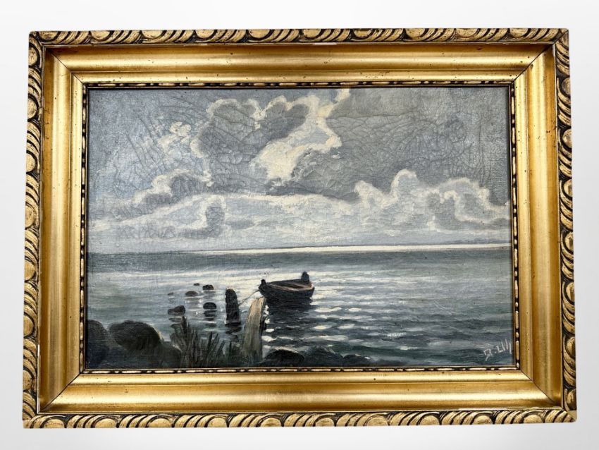 Danish school : Sunset at a coast with moored boat, oil on canvas, 48cm x 31cm.