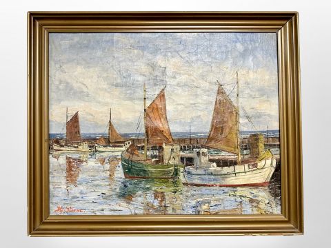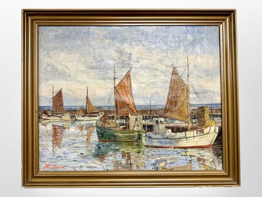 H Sterm : Fishing boats in a harbour, 49cm x 39cm.