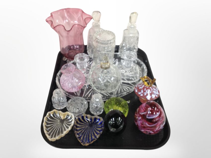 A group of 20th century glass wares, Caithness vase, dressing table glass ware, paperweights, scent bottles with stoppers