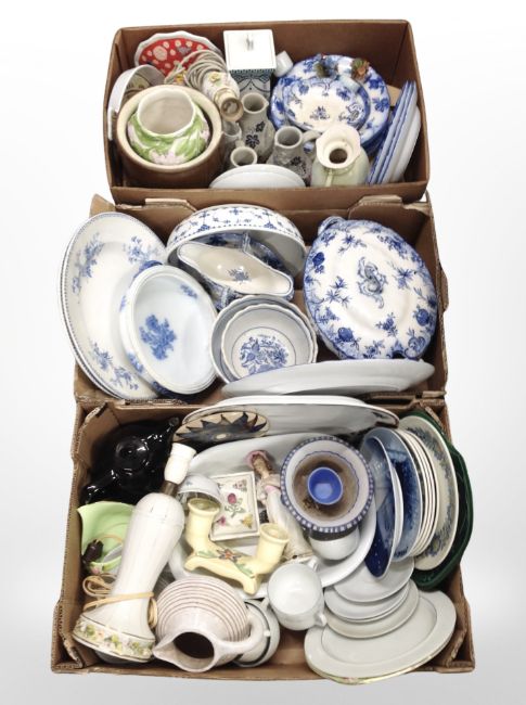Three boxes of 20th century Danish ceramics including lamp base, blue and white dinner ware, stoneware pot etc