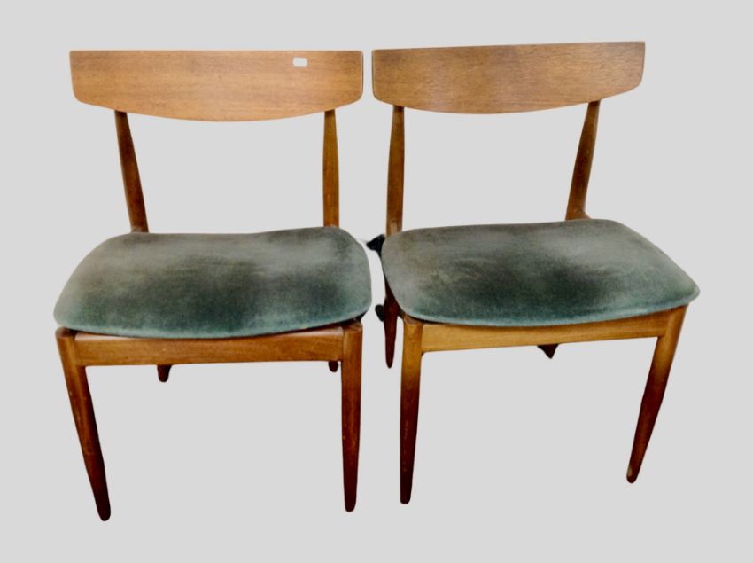 A G-Plan teak extending dining table, total length 150 cm, and a matching set of four dining chairs in green upholstery