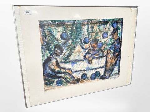 Danish school colour print depicting workmen, limited edition, indistinctly signed, 56cm x 45cm.