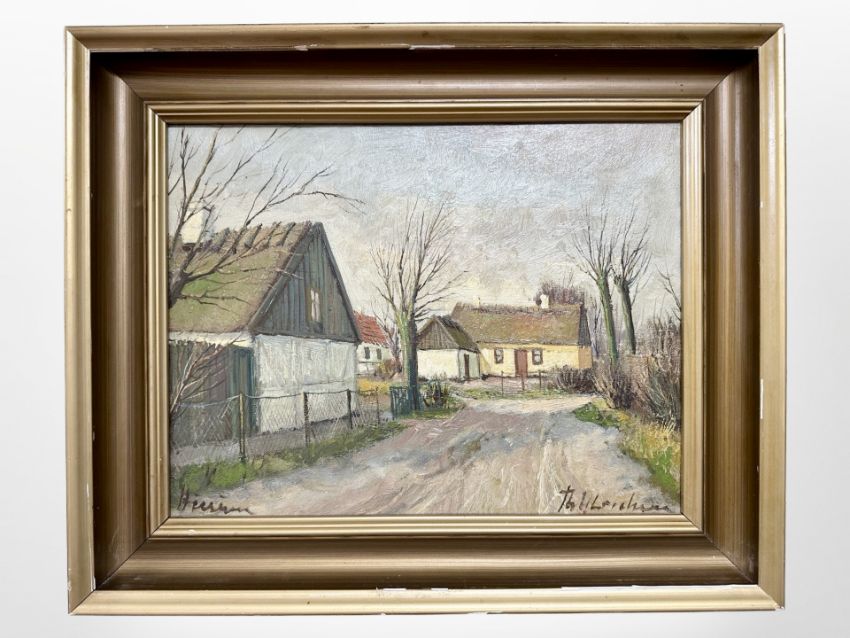 Danish school : Farm buildings on a lane, oil on canvas, 34cm x 26cm.