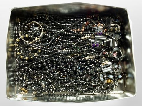 A tin containing hematite jewellery.
