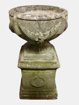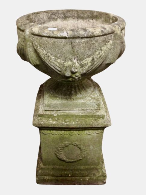 A weathered concrete garden urn on plinth, height 73 cm together with a further urn