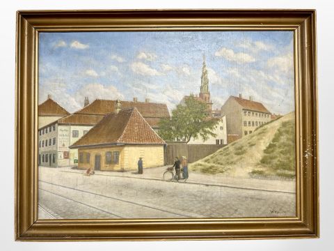 W Hansen : Figures on a cobbled street with a view of the Church of Our Saviour, Copenhagen, oil on canvas, 55cm x 39cm.