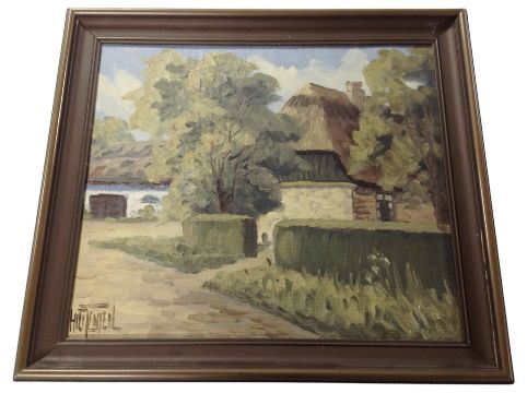 Danish School : Farm buildings with thatched roof, oil on canvas, 31 cm x 35 cm, indistinctly signed