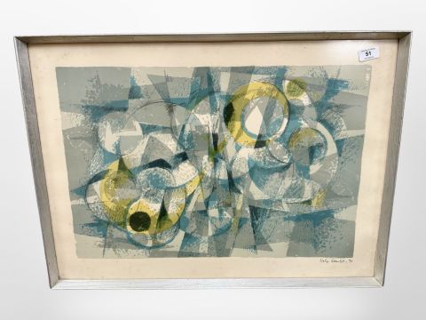 A continental abstract colour print, indistinctly signed, 70cm x 50cm.