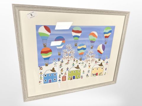 Gordon Barker : Balloons flying over a winter landscape, 39cm x 29cm.