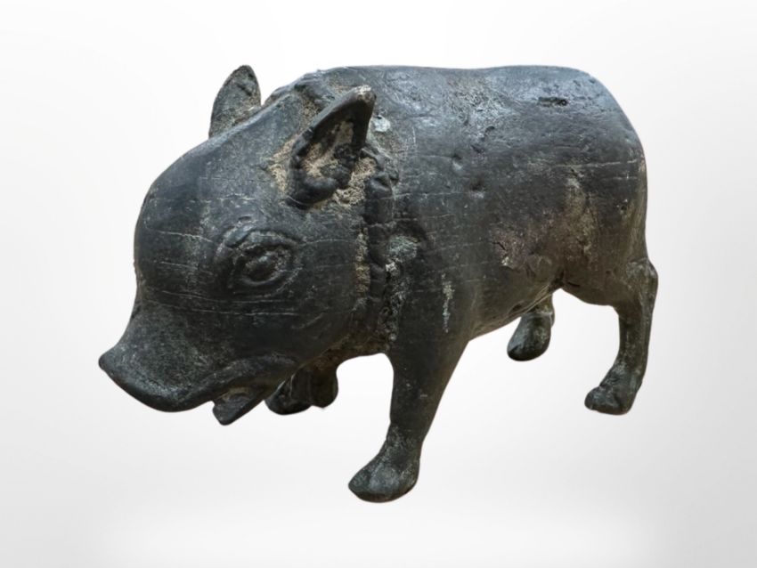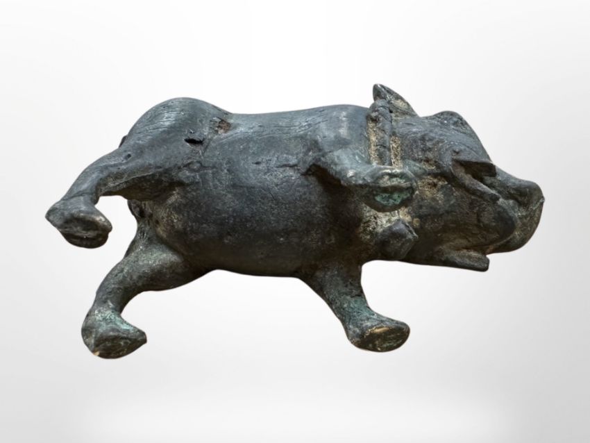 An antique bronze figure of a boar, probably Roman, length 9 cm, height 6 cm.