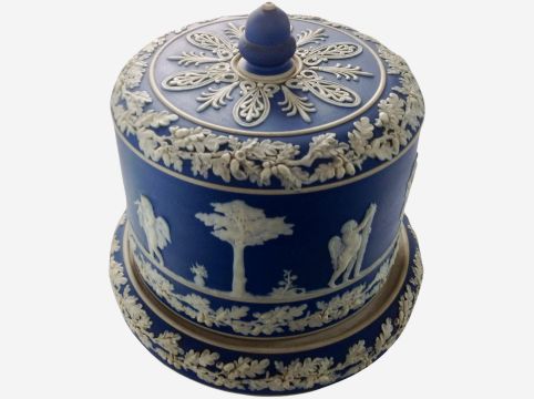 A Wedgwood blue and white Jasperware cheese dish and cover, height 24cm.